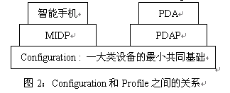 Profile则定义了针对PDA的API,其屏幕,内存条件都要大于MIDP,但是网络方面的要求则显然和手机有所不同。如下图所示,同属于一个
