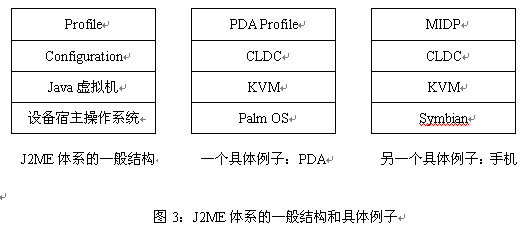 J2ME 体系的一般结构是:由Configuration定义的Java虚拟机运行于设备的宿主操作系统之上,构成整个平台的基
