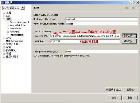 点击左侧树中的“J2ME”,出现如下图界面。这里唯一需要配置的是WTK Root。在这一项中要填入WTK的安装根目录。例如,我的WTK安装在D:\WTK22。其余的使用默认即可。值得一提的是Antenna JAR这一项。Antenna JAR不是一个必设项,但是使用Antenna Jar能够编写Ant文件,轻松打包J2ME程序。(有时间我会介绍如何用Antenna JAR编写打包J2ME程序的Ant脚本。)