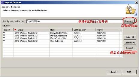 点击“Device Management”,出现(图3)配置界面。点击“Browse”,选择WTK安装目录下的bin文件夹。例如我的bin文件夹的路径为D:\ WTK22\bin。然后再单击“Refresh”。插件会自动搜索出可用的设备。