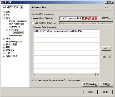 设置前请先下载Proguard。目前Proguard的最新版本是3.6Beta(4.0正在开发中)。我用的是3.5。你可以在此下载到: EclipseME单击“Obfuscation”,出现下图界面。在“Progurd Root Directory”填入Proguard的安装目录。