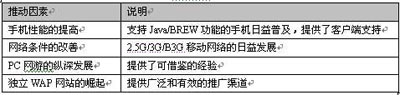 手机网游发展的一些推动因素可以简单的归纳如表1所示,如手机性能的提高、移动网络带宽的改善、PC网游的深入发展、独立WAP网站的崛起。