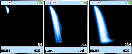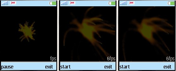 和火焰大同小异,blur算法换回了标准的算法。主要是物理模型变动,加速度很重要,因为它可以改变物体的运动方向。这个例子在Nokia3310上有13fps。