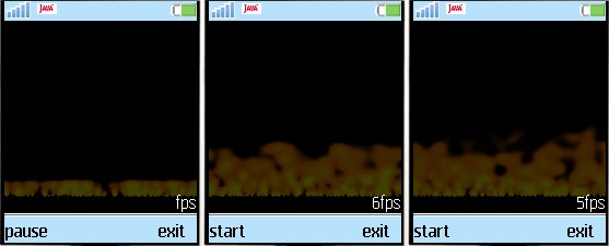 blur算法就是取一点为自身和自身正下方、左下方、右下方四点的平均值。这样一来,火焰就诞生了。这个例子在Nokia3310上有13fps。因为选