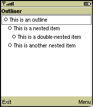 在这篇文章里,我们通过建立一个简单的 Outliner MIDlet,来研究这些新的定制功能。大纲是用来组织想法、保持列表,甚至进行项目计划的工具——是一个在移动设备上非常有用的应用程序。Outliner MIDlet让用户可以构建层次结构良好的窗体项目大纲。它们可以加入或删除,缩进或凸出,