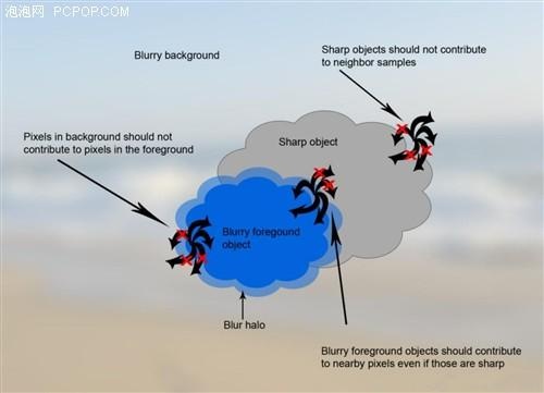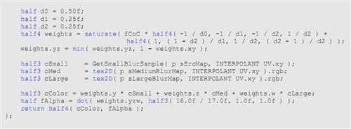 ◆最高模糊图像与RGB样本加权由缩减CoC执行,Alpha通道中载有CoC,也有模糊,但其样本不加权本身;