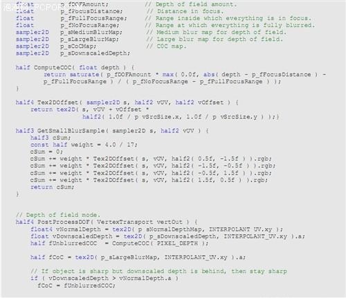 ◆然后开始最后的景深着色,有一定的形象来源,中等和大型模糊、模糊CoC的形象,非模糊深入地图和缩减深入形象的渲染。
