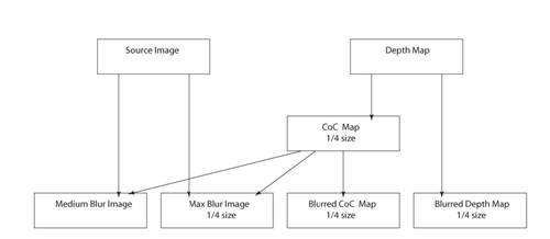 ◆产生的最大模糊图像只有缩小的RGB的图像缓冲区源图像的四分之一,每一个CoC和大型模糊缓冲器可以同时使用不同的通道;