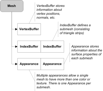 A Mesh is composed of one or more submeshes and their associated Appearances. A submesh is an array of triangle strips defined by an IndexBuffer object. The triangle strips are formed by indexing the vertex coordinates and other vertex attributes in an associated VertexBuffer. All submeshes in a Mesh share the same VertexBuffer. However, in the case of a MorphingMesh, a weighted linear combination of multiple VertexBuffers is used in place of a single VertexBuffer.