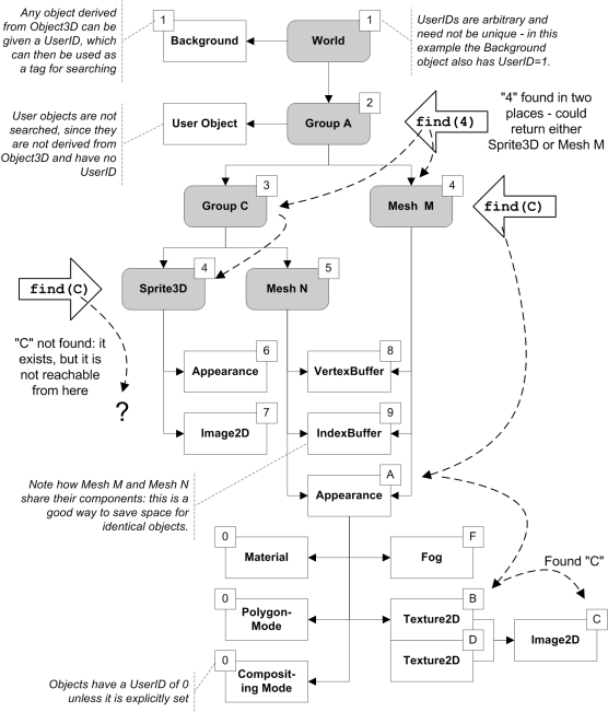 Every Object3D can be assigned a user ID, either at authoring stage or at run time with the setUserID method. User IDs are typically used to find a known object in a scene loaded from a data stream.