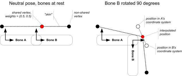 Each vertex is transformed once for each Node affecting it. The results are then blended together according to the weight factors of each node. To get an initial idea of how this works, see the figure below. A more formal definition follows.