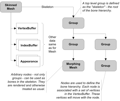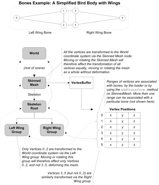 If a vertex v has no transformations associated with it, as is the case for all vertices in a newly constructed SkinnedMesh, the vertex lies implicitly in the coordinate system of the SkinnedMesh node itself. That is, a SkinnedMesh in its initial state is equivalent to an ordinary Mesh. When a vertex is explicitly associated with any bone in the skeleton, the implicit association with the SkinnedMesh node is removed.