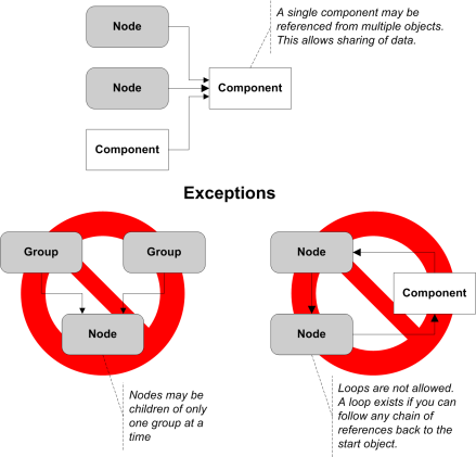 Despite that it is called a graph, the scene graph is actually a tree structure. This implies that a node can belong to at most one group at a time, and cycles are prohibited. However, component objects, such as VertexArrays, may be referenced by an arbitrary number of nodes and components. The basic rules for building valid scene graphs are summarized below.