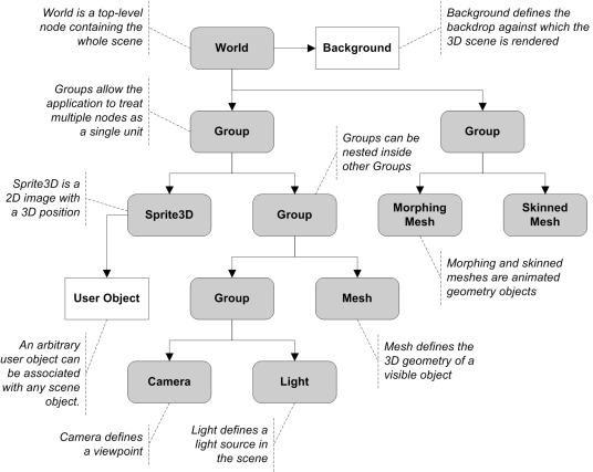 Note that a scene graph need not be complete in order to be rendered; individual nodes and branches can be rendered using a separate method in Graphics3D. However, the semantics of rendering an incomplete scene graph are slightly different compared to rendering a World; see Graphics3D for more information.