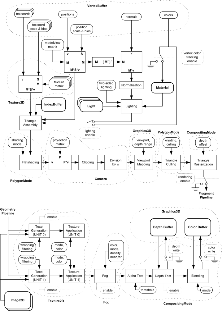 The reference geometry and fragment pipelines are shown below. A rough mapping of Mesh components and other objects to the pipeline stages is also shown. Note that the ordering of the stages is the same as in OpenGL. Implementations may optimize their operation by doing things in a different order, but only if the result is exactly the same as it would be with the reference pipelines.