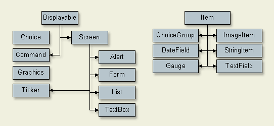 lcdui包内基本上定义了三组GUI组件,我是根据其基类对它们分组的,它们是Screen组件、Item组件和Miscellaneous Displayable组件。