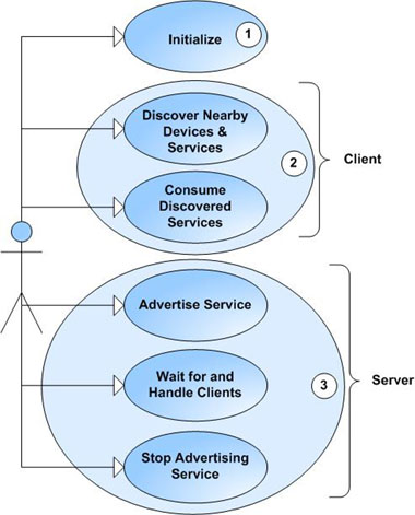 .客户端–一个客户对远端服务进行消费。首先它要发现所有附近的设备,然后对于每一个发现的设备搜索它感兴趣的服务。